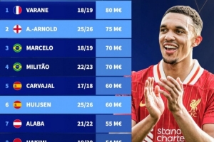 體育資訊6月4日訊 德國轉(zhuǎn)會市場網(wǎng)統(tǒng)計了皇馬隊史后衛(wèi)身價榜單,今夏新援阿諾德德轉(zhuǎn)身價7500萬歐元第二,懷森6000萬歐元第六。