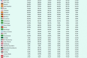 體育資訊6月4日訊 ClubEl預(yù)測了世俱杯各球隊(duì)晉級(jí)各階段的概率,并列出表格,巴黎奪冠概率17.5%最高,邁阿密國際小組出線概率33.7%。