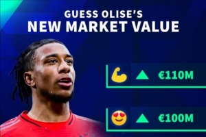 23歲的奧利塞目前的身價為8000萬歐,他在去年夏天以5300萬歐加盟拜仁,本賽季為拜仁各項賽事出場50次,貢獻17球18助攻。