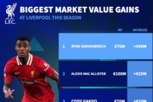 本賽季利物浦隊(duì)內(nèi)身價(jià)上漲榜: