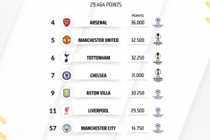 體育資訊6月6日訊 2024-25賽季的歐戰(zhàn)賽事已全部結(jié)束,數(shù)據(jù)機(jī)構(gòu)Football Rankings公布了英超球隊歐戰(zhàn)積分排名情況,阿森納以36分位居全歐第4,5隊進(jìn)入前10,利物浦第11位,曼城僅位居第57位。