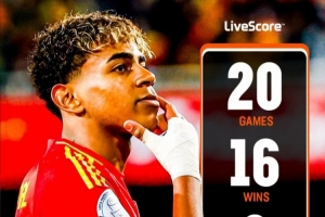 據(jù)LiveScore的數(shù)據(jù)統(tǒng)計(jì),在代表西班牙出戰(zhàn)的正式比賽中,亞馬爾還未嘗敗績。