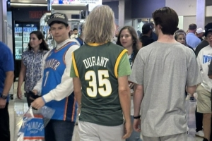 賽前鏡頭捕捉到,有球迷身穿杜蘭特超音速時期的球衣到場。