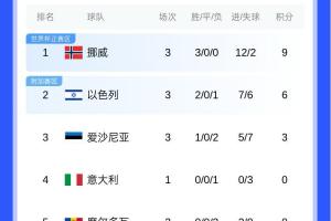 挪威以9分排名I組第一,以色列6分第二。意大利只踢了一場暫排倒數(shù)第二。