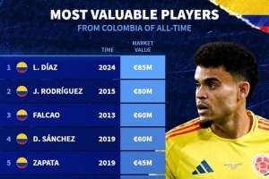 哥倫比亞球員德轉(zhuǎn)歷史身價(jià)排名: