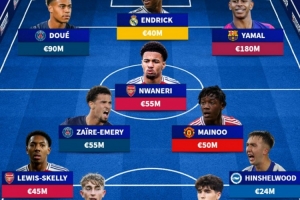 前鋒:杜埃(巴黎,9000萬(wàn)歐)、恩德里克(皇馬,4000萬(wàn)歐)、亞馬爾(巴薩,1.8億歐)