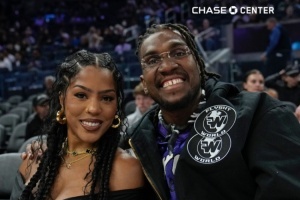 勇士球員盧尼攜夫婚妻瑪麗亞-西蒙來到大通中心看球。