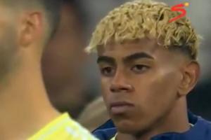賽后葡萄牙眾將開心慶祝,此時鏡頭給到了西班牙隊的亞馬爾,亞馬爾面無表情抿嘴。
