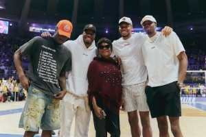 體育資訊6月9日訊 今日,雄鹿球星字母哥攜哥哥薩納西斯(左二)、弟弟科斯塔斯(右一)、亞歷克斯(左一)還有母親前往巴西,觀看了2025世界女排聯(lián)賽分站賽第一周巴西女排vs意大利女排的比賽,賽后還與女排隊(duì)員親切合影。