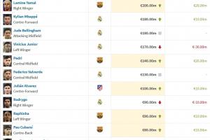 體育資訊06月09日訊 德轉(zhuǎn)更新西甲聯(lián)賽身價(jià),亞馬爾2億歐元成為世界第一,姆巴佩上漲1000萬(wàn)升至1.8億歐元,維尼修斯下降3000萬(wàn)降至1.7億歐元。