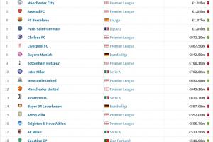 體育資訊06月09日訊 德轉(zhuǎn)最新一期身價更新后,足壇俱樂部身價排名發(fā)生變化,最新身價前20的俱樂部如下(單位:歐元):