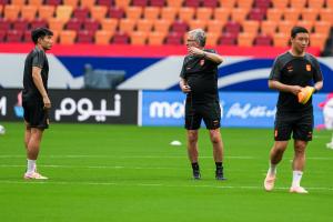 國足眾將的神情都比較放松,主帥伊萬科維奇則和鄭智等教練組成員一起商討戰(zhàn)術(shù)。