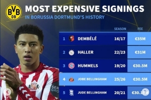 體育資訊6月11日訊 多特已經(jīng)官方宣布簽下小貝林厄姆,據(jù)悉基礎(chǔ)轉(zhuǎn)會費3050萬歐元,《轉(zhuǎn)會市場》也統(tǒng)計了多特隊史的引援榜單。