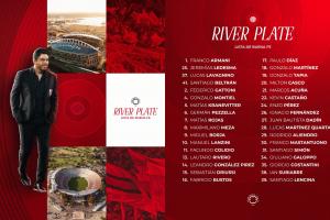中場(chǎng):5-克拉內(nèi)維特爾、10-蘭奇尼、18-貢薩洛-馬丁內(nèi)斯、22-卡斯塔尼奧、24-恩佐-佩雷斯、26-伊納西奧-費(fèi)爾南德斯、29-阿利恩德羅、30-馬斯坦托諾、31-圣地亞哥-西蒙、34-加洛珀、35-喬治-康斯坦丁、39-倫奇納