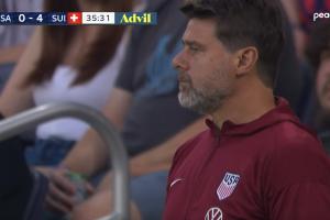 上半場(chǎng)第36分鐘,瑞士隊(duì)已經(jīng)取得了4-0領(lǐng)先,打崩了美國。場(chǎng)邊美國主帥波切蒂諾風(fēng)中凌亂不知所措。
