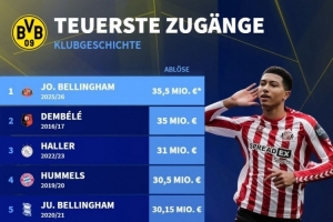 體育資訊6月11日訊 德國轉(zhuǎn)會市場統(tǒng)計了多特隊史引進(jìn)球員的轉(zhuǎn)會費,并列出榜單,喬布-貝林厄姆3550萬歐居首,登貝萊、阿萊前三。