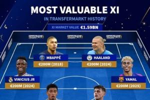 體育資訊06月11日訊 德轉(zhuǎn)在25周年之際列出網(wǎng)站歷史身價最貴陣容,哈蘭德、姆巴佩、亞馬爾、維尼修斯以2億歐領(lǐng)銜。