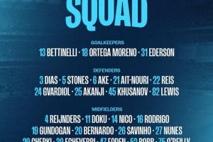 中場(chǎng):4-賴因德斯、11-多庫(kù)、14-尼科-岡薩雷斯、16-羅德里、19-京多安、20-B席、26-薩維尼奧、27-努內(nèi)斯、29-切爾基、30-埃切維里、47-福登、52-鮑勃、75-奧賴?yán)?/p>