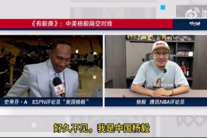 體育資訊6月12日訊 NBA總決賽G3現(xiàn)場,“美國楊毅”A-史密斯和楊毅視頻連線。