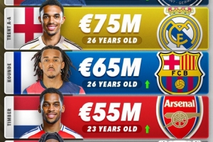 體育資訊6月13日訊2024-25賽季結(jié)束,Score 90更新了右后衛(wèi)身價(jià)排行,巴黎圣日耳曼后衛(wèi)阿什拉夫8000萬歐元第一,皇馬新援阿諾德7500萬歐元第二。