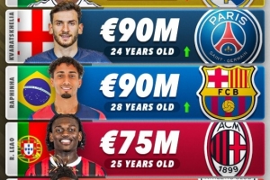 克瓦拉茨赫利亞(巴黎圣日耳曼):9000萬歐元
