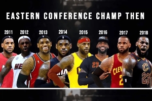 詹姆斯自2011年至2018年連續(xù)八年代表熱火和騎士奪得東部冠軍