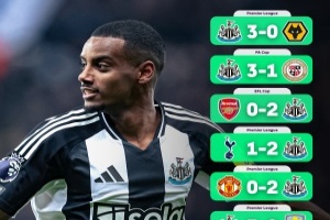 體育資訊1月16日訊?本輪英超,紐卡3-0擊敗狼隊(duì),聯(lián)賽取得六連勝,各賽事9連勝!