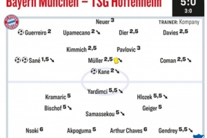 體育資訊1月16日訊 在本輪德甲,拜仁5-0大勝霍芬海姆,《踢球者》也為拜仁球員本場表現(xiàn)做出評分,其中本場薩內(nèi)梅開二度、凱恩傳射建功,均獲得高分,以下為具體情況(德媒評分1分最高,6分最低):