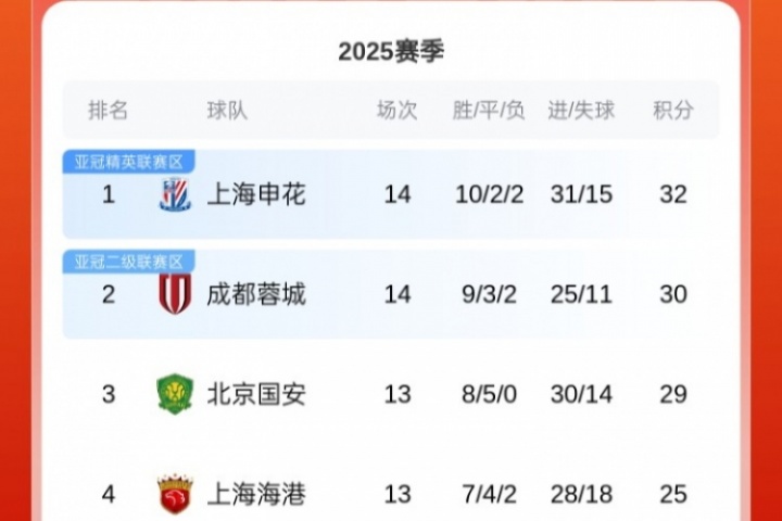 排名第三的國(guó)安2-1小勝亞泰,在少賽一場(chǎng)的情況下只落后申花3分。