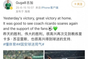 今日國(guó)安外援古加更新社媒,昨晚的比賽他首發(fā)踢滿全場(chǎng)。古加寫道: