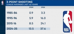24-25賽季,場(chǎng)均37.6次出手,命中13.5個(gè)