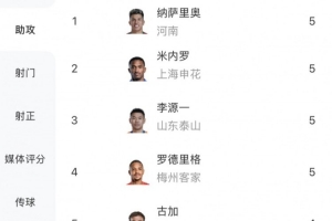 體育資訊6月15日訊 今日,中超聯(lián)賽官方更新了聯(lián)賽截至昨晚22時(shí)的助攻榜,其中河南外援納薩里奧、申花外援米內(nèi)羅、李源一以及梅州外援羅德里格均貢獻(xiàn)5次助攻,并列排在聯(lián)賽助攻榜首位。