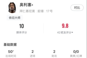 體育資訊6月16日訊 世俱杯小組賽C組首輪,拜仁半場6-0奧克蘭城,首發(fā)出戰(zhàn)的拜仁右邊鋒奧利塞數(shù)據(jù)如下: