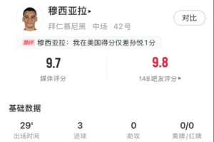 體育資訊6月16日訊 世俱杯小組賽首輪,拜仁10-0奧克蘭城,穆西亞拉替補出戰(zhàn),球員此役數(shù)據(jù)如下: