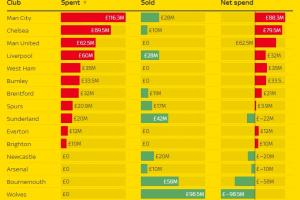 而曼城是花錢(qián)最多的俱樂(lè)部,他們豪擲1.163億鎊引進(jìn)了4名球員。狼隊(duì)則是賺的最多的,他們一人沒(méi)買(mǎi)凈賺9850萬(wàn)鎊。