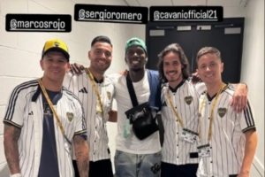 博格巴與羅霍、羅梅羅、卡瓦尼、埃雷拉四人合影,并配文寫道:“見到老朋友們真開心?!?/p>