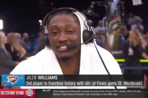 本場比賽,杰倫威25投14中,三分5中3,罰球12中9,轟生涯季后賽得分紀(jì)錄的40分,另有6板4助,正負(fù)值+14