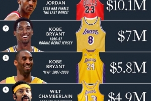 第一是喬丹1998年總決賽“最后一舞”的球衣,1010萬美元;