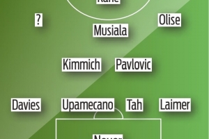 諾伊爾;阿方索-戴維斯、于帕梅卡諾、塔、萊默爾;基米希、帕夫洛維奇、待引進的左邊鋒、穆西亞拉、奧利塞、凱恩