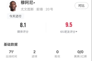 體育資訊6月19日訊 世俱杯小組賽G組第1輪,尤文5-0大勝艾因,穆阿尼首發(fā)出戰(zhàn)71分鐘,打進(jìn)2球,獲評(píng)8.1分。