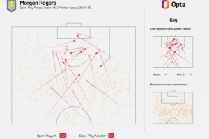 據(jù)Opta統(tǒng)計,羅杰斯本賽季聯(lián)賽助攻10次英超第4多,完成66次過人英超第6多。