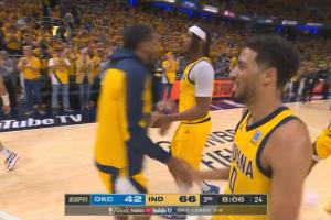 兩隊半場比分——步行者64-42雷霆(雷霆投籃6-0,步行者投籃9-1)
