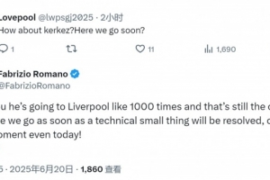 羅馬諾社媒報道維爾茨接受利物浦體檢的消息,有球迷詢問科爾克茲的交易進展,羅馬諾回復道:“我已經(jīng)跟你們說過一千次他將加盟利物浦了,現(xiàn)在情況依然如此。一旦技術(shù)上的小問題解決,就可以here we go,隨時可能發(fā)生,甚至可能在今天!”