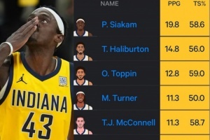 據(jù)統(tǒng)計(jì),總決賽前6場(chǎng),步行者無(wú)人場(chǎng)均得分能超過(guò)20分,但有8人場(chǎng)均得分上雙,具體為: