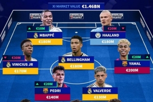 前鋒:維尼修斯(皇馬,1.7億歐)、姆巴佩(皇馬,1.8億歐)、哈蘭德(曼城,1.8億歐)、亞馬爾(巴薩,2億歐)