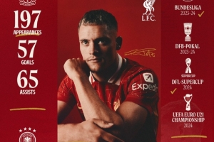 利物浦官推曬出了維爾茨職業(yè)生涯迄今為止的一些數(shù)據(jù)和榮譽。維爾茨共為勒沃庫森出戰(zhàn)197場比賽,打進57球并送出65次助攻。在國家隊層面,他為德國出戰(zhàn)31場比賽,有7球入賬。