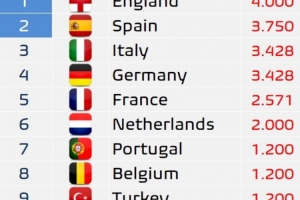 體育資訊6月21日訊 近日,數(shù)據(jù)機構(gòu)Football Meets Data公布了下賽季歐洲聯(lián)賽歐戰(zhàn)積分,英格蘭在2025/26賽季將再次爭取額外的歐冠席位。