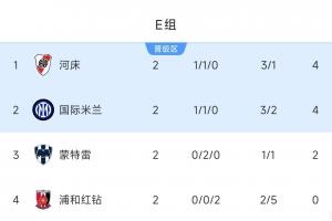 體育資訊06月22日訊 世俱杯小組賽E組第2輪戰(zhàn)罷,國(guó)米2-1擊敗浦和紅鉆,河床0-0戰(zhàn)平蒙特雷。河床目前憑借凈勝球優(yōu)勢(shì)排在小組第1,國(guó)米次席,蒙特雷第3,浦和紅鉆兩連敗提前出局。