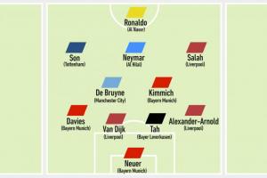 中場(chǎng):孫興慜(熱刺)、內(nèi)馬爾(利雅得新月)、薩拉赫(利物浦)、德布勞內(nèi)(曼城)、基米希(拜仁)