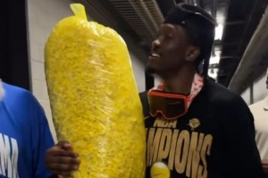 賽后,雷霆球員杰倫-威廉姆斯抱著一大袋爆米花離場,并開玩笑道:“我要逃離這里了,這包東西好像比獎杯還要重?!?/p>